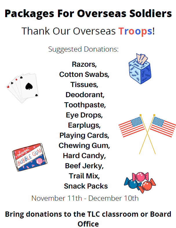 Starting Nov. 11 and running through Friday, Dec. 10, care package items may be dropped off at South Central High School or Board Office.